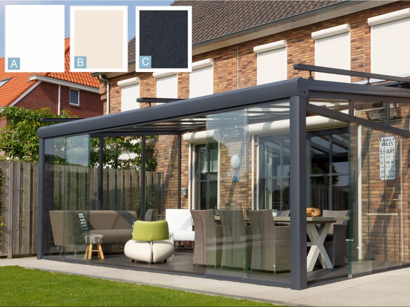 Neben den Abmessungen können Sie die Profile in den beliebten RAL Farben: Weiß (A), Elfenbein (B) und Anthrazit (C) auswählen. Gegen Aufpreis können die Profile auch in jeder gewünschten Farbe beschichtet werden. Erweitern Sie Ihr Terrassendach nach Wunsch mit Sonnenschutz und Zubehör wie LED-Beleuchtung, Heizstrahler und Glasschiebewände bis zu einem kompletten Gartenzimmer.
