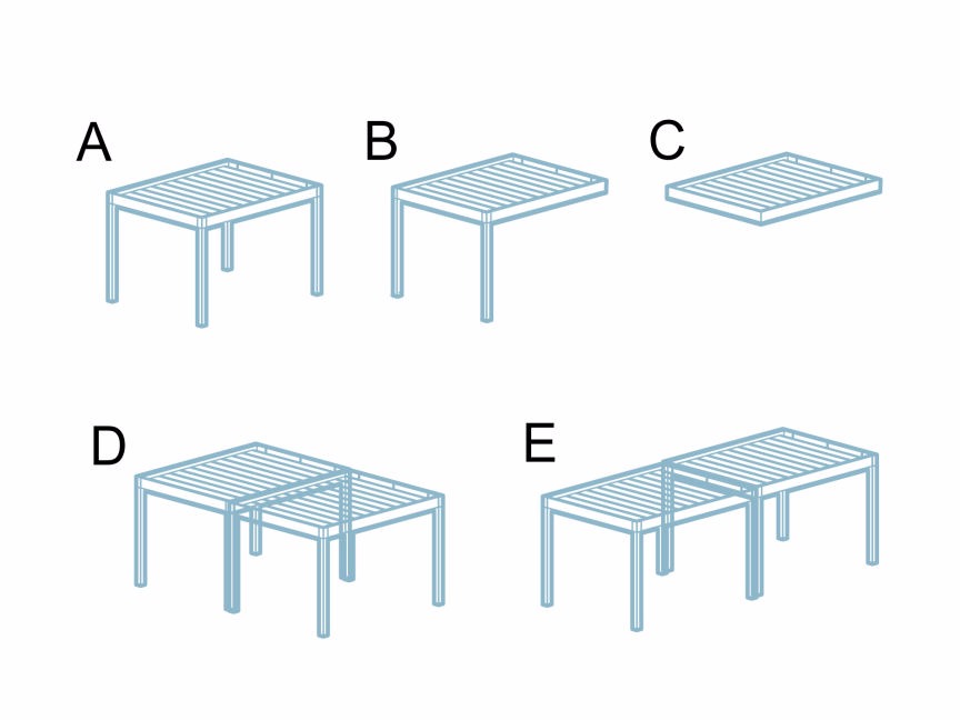 Das Lamellendach V870 Arezzo kann auf einem bereits vorhandenen Gebäude ohne Pfosten (C), als Fassadenmontage (B) mit 2 Pfosten oder freistehend (A) mit vier Pfosten installiert werden. Um sicherzustellen, dass Wasser gut abfließen kann, wird eine Entwässerung über ein oder mehr Pfosten vorbereitet. Um größere Spannweiten zu überbrücken können mehrere Lamellendächer (D, E) gekoppelt werden.